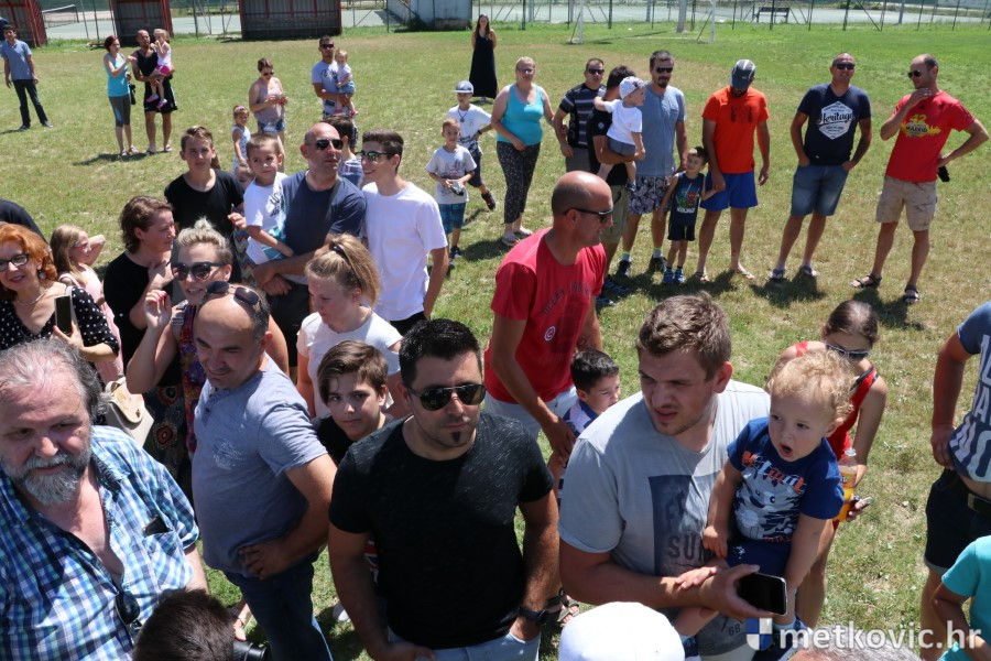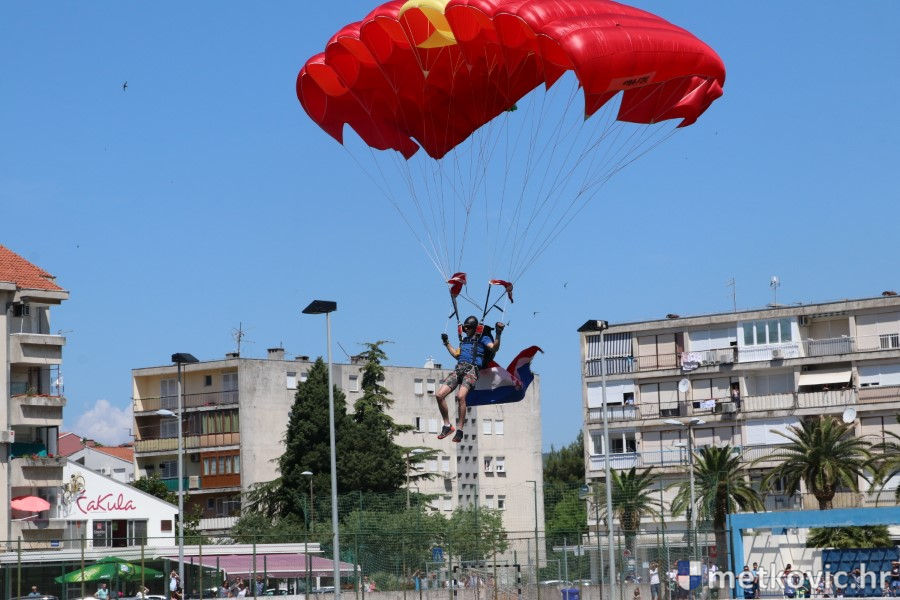 Svečani mimohod sudionika proslave krenuo je s Trga ka Igralištu Iza Vage, na kojemu je desetorica padobranaca iz Aerokluba Sinj izvela atraktivne skokove sa zastavama Republike Hrvatske, gradova Metkovića i Sinja te Udruge veterana IV. gbr. Poslije skokova građani su na pomoćnome nogometnom igralištu mogli razgledati helikopter HRZ-a MI-8, iz kojega su padobranci bili skakali. Naravno, najviše su se tome radovala djeca.