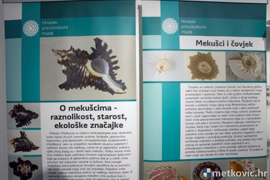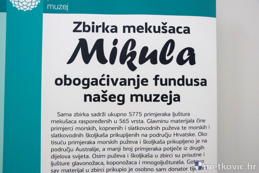 22.7.2018. - Gostujuća izložba Hrvatskoga prirodoslovnoga muzeja, koju svakako preporučujemo pogledati, otvorena je 17. srpnja u Prirodoslovnome muzeju Metković. Riječ je o vrijednoj donaciji ljuštura mekušaca, koje je HPM-u darovao umirovljeni sveučilišni profesor Miroslav Mikula, koji je tijekom 70 godina prikupio 5775 primjeraka ljuštura, raspoređenih u 565 vrsta.