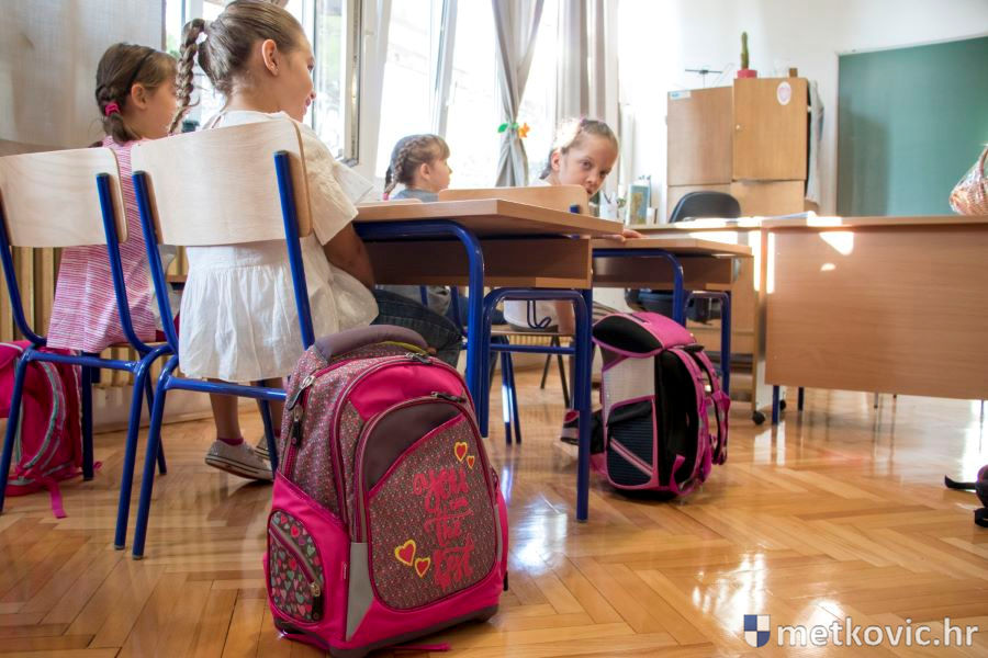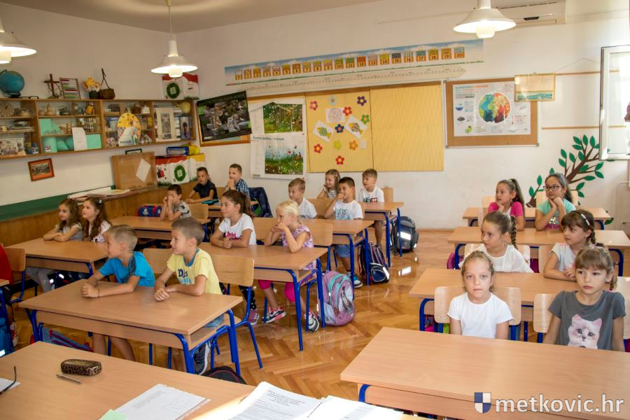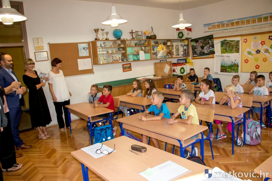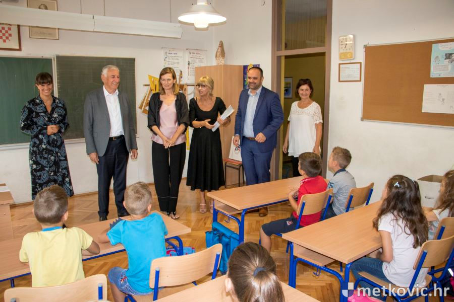 Goste je prvo primila ravnateljica Žana Dodig i zahvalila im na potpori koju pružaju njezinoj školi. Pri tome je županu Dobroslavića darovala umjetničku sliku, rad slikarice i učiteljice likovne kulture u toj školi Dubravke Šešelj. Potom su se uputili u učionicu u kojoj su ih čekali prvašići iz 1. c razreda s učiteljicom Davorkom Govorko. Župan im je čestitao početak nove školske godine, zaželio im uspjeh te poručio da škola nije samo rad nego je i uživanje. Svaki je učenik od Županije dobio enciklopediju o životinjama, a od Grada slikovnicu Hrvatska za djecu.