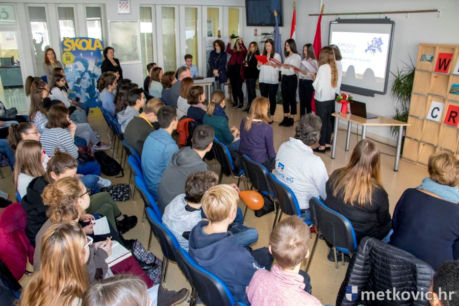 Nakon što je školski zbor otpjevao himnu EU, okupljene u školskoj knjižnici pozdravila je koordinatorica Projekta prof. Branka Vladimir, a potom im je dobrodošlicu te ugodan i sadržajan boravak u našem gradu zaželio ravnatelj prof. Jozo Jurković. Uime gostiju, domaćinima je zahvalila prof. Melinda Veggian iz njemačke koordinatorske škole, a potom su naši gimnazijalci održali prezentaciju o tradicijskim obrtima našega kraja.