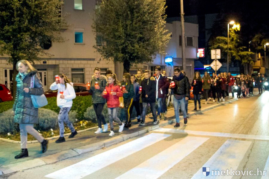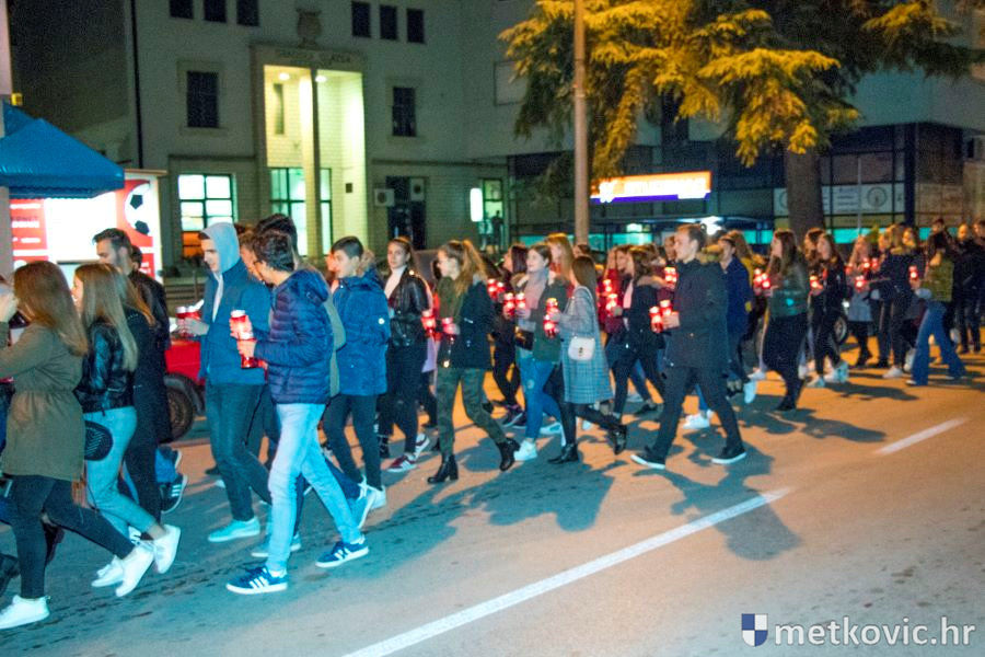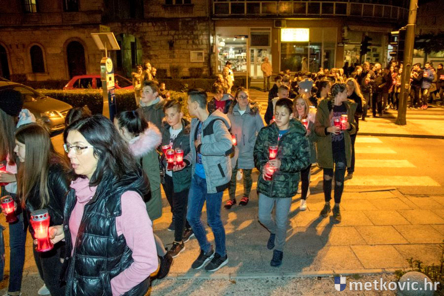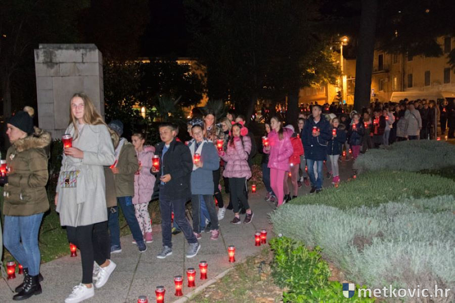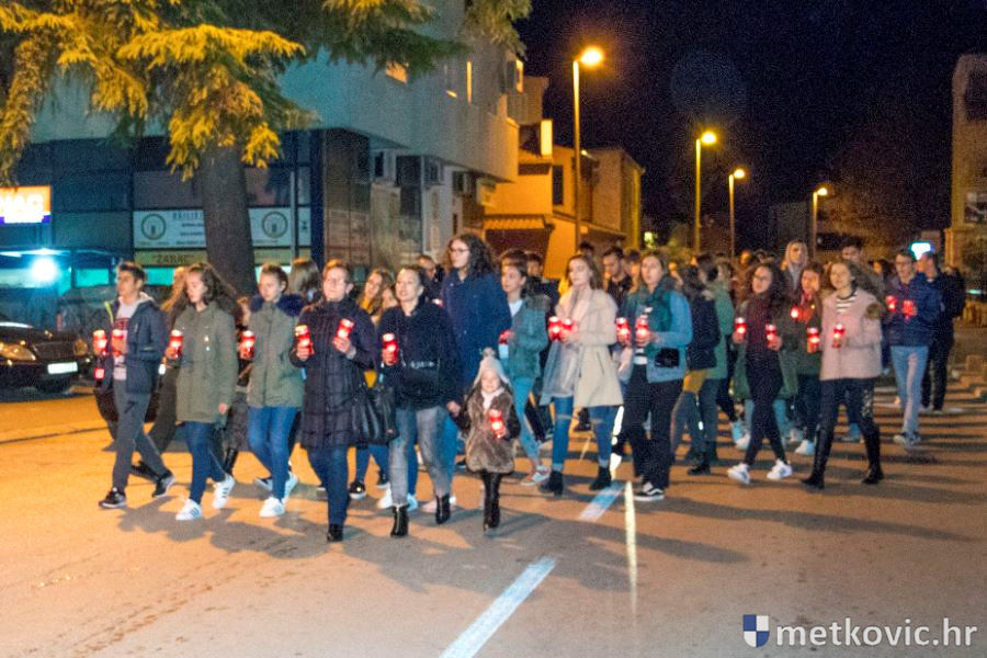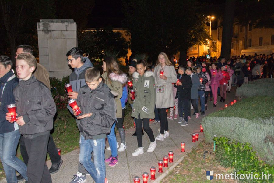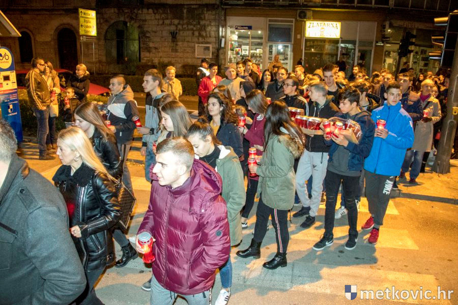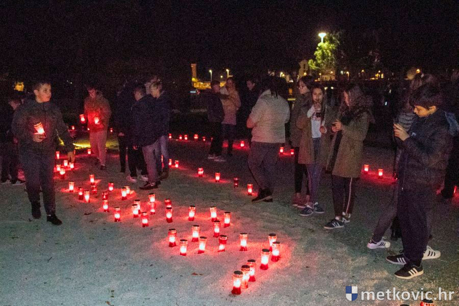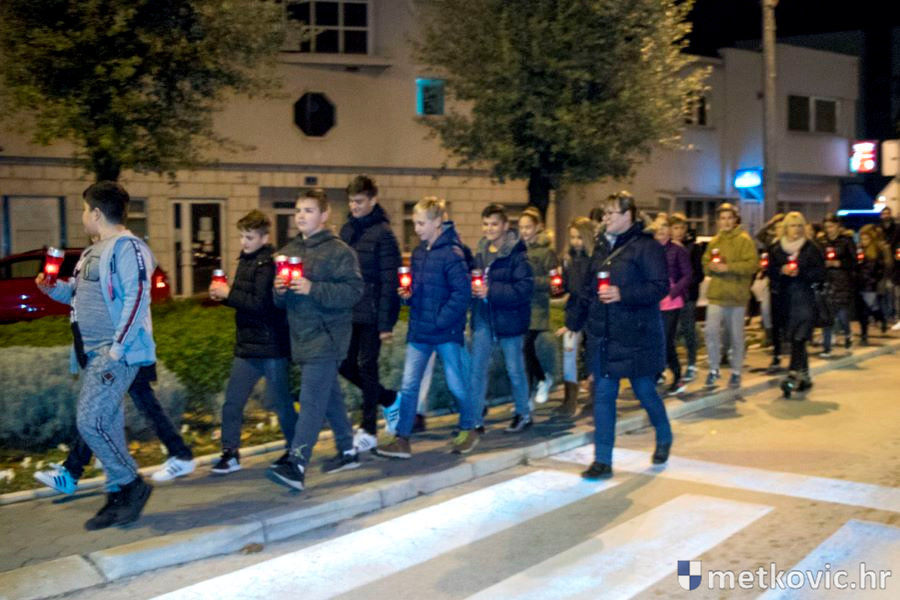 18.11.2018. - Učenici dviju osnovnih i dviju srednjih metkovskih škola, njih pet-šest stotina, sinoć se u tišini, s upaljenim svijećama u rukama od svojih škola uputilo ka Gradskome parku, u kojemu je priređen komemorativni program u znak sjećanja na 18. studenoga 1991., dan kada je neprijatelj slomio junački otpor Vukovaraca, a u Škabrnji zvjerski pobio 84 Hrvata, mahom civila.