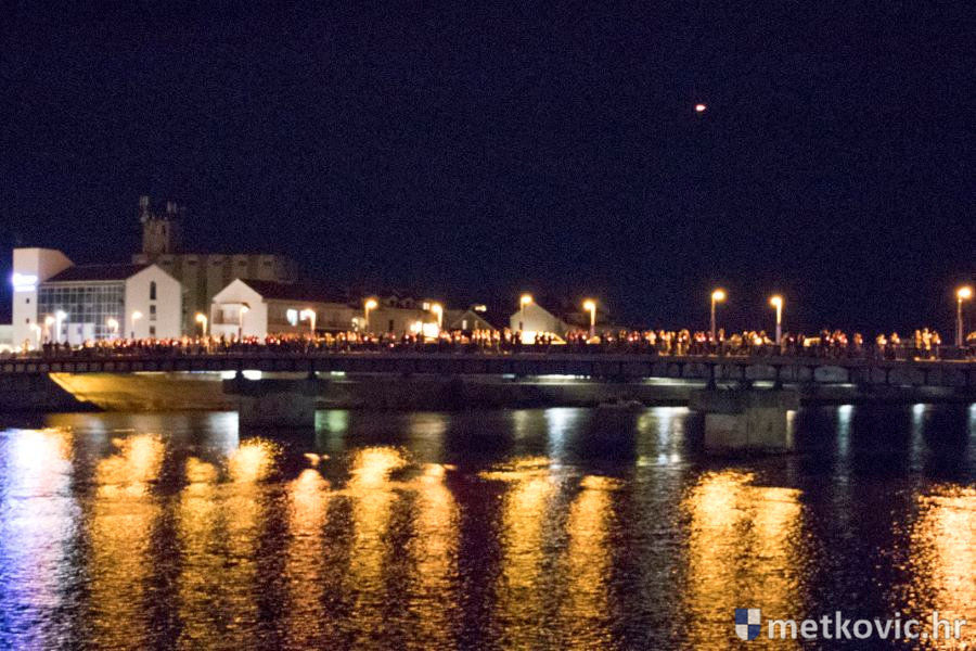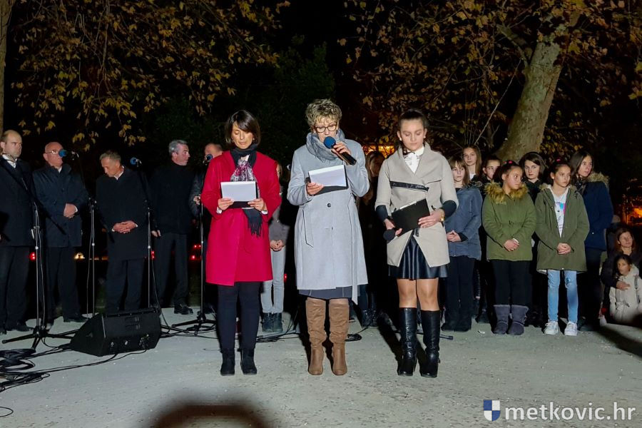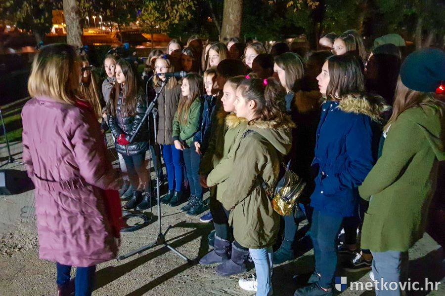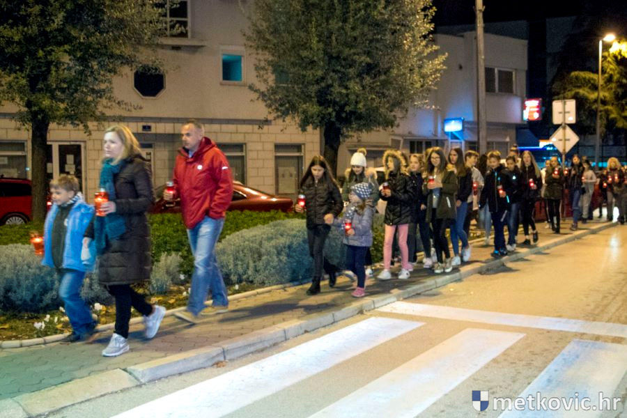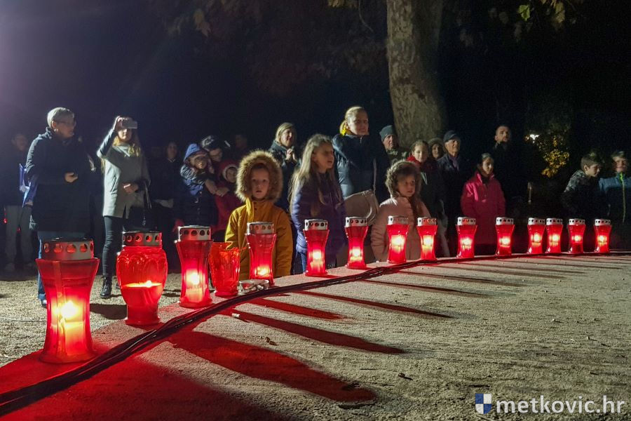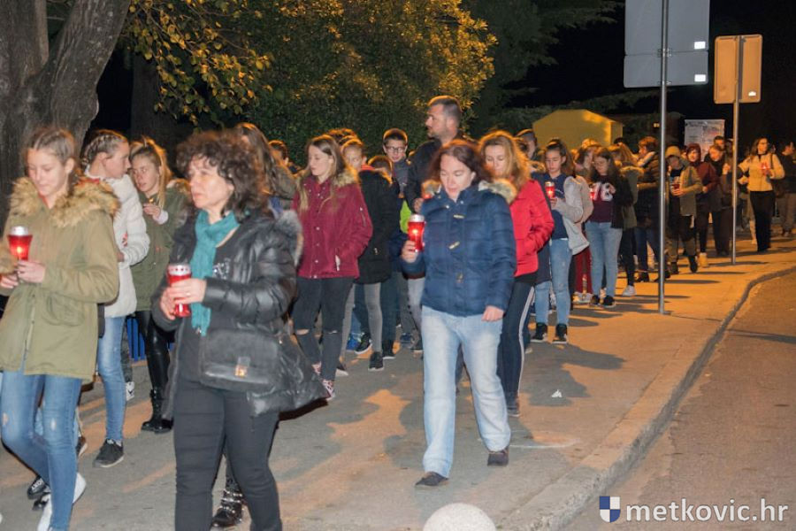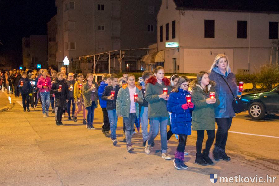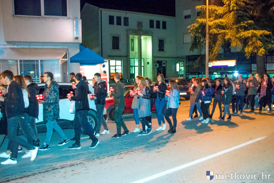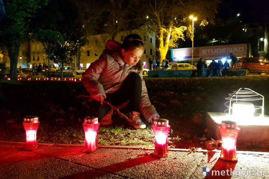 18.11.2018. - Učenici dviju osnovnih i dviju srednjih metkovskih škola, njih pet-šest stotina, sinoć se u tišini, s upaljenim svijećama u rukama od svojih škola uputilo ka Gradskome parku, u kojemu je priređen komemorativni program u znak sjećanja na 18. studenoga 1991., dan kada je neprijatelj slomio junački otpor Vukovaraca, a u Škabrnji zvjerski pobio 84 Hrvata, mahom civila.