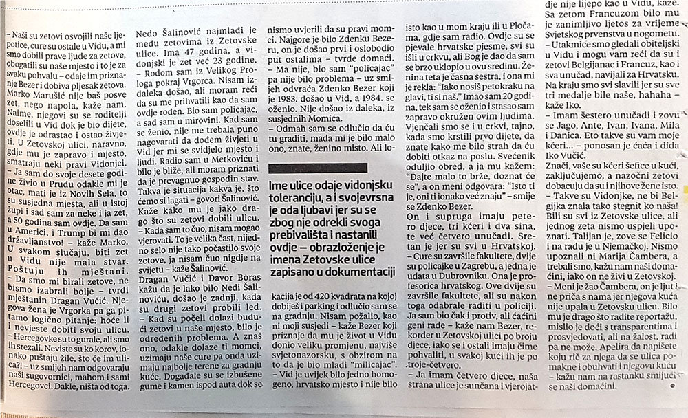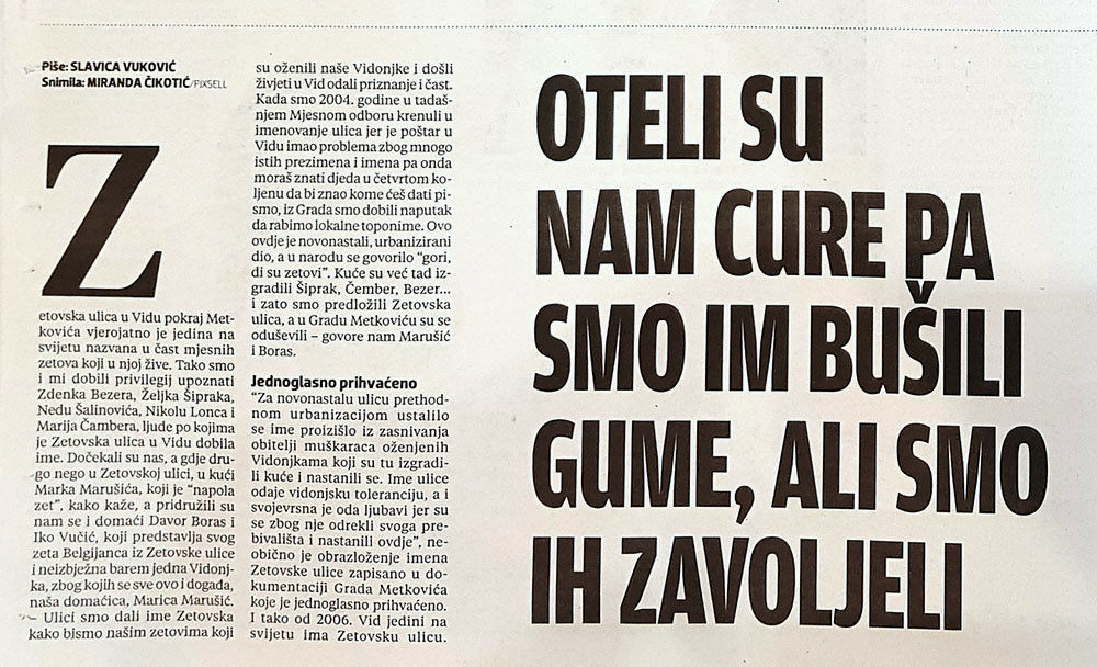 Metković, 2.12.2018. - Još ljetos smo, u sklopi vijesti o posjetu Domagoja Vide Metkoviću, spominjali jednu vidonjsku zanimljivost – Zetovsku ulicu, kakve (valjda) nema nigdje u svijetu. Danas je osvanula na „duplerici“ Večernjega lista.
