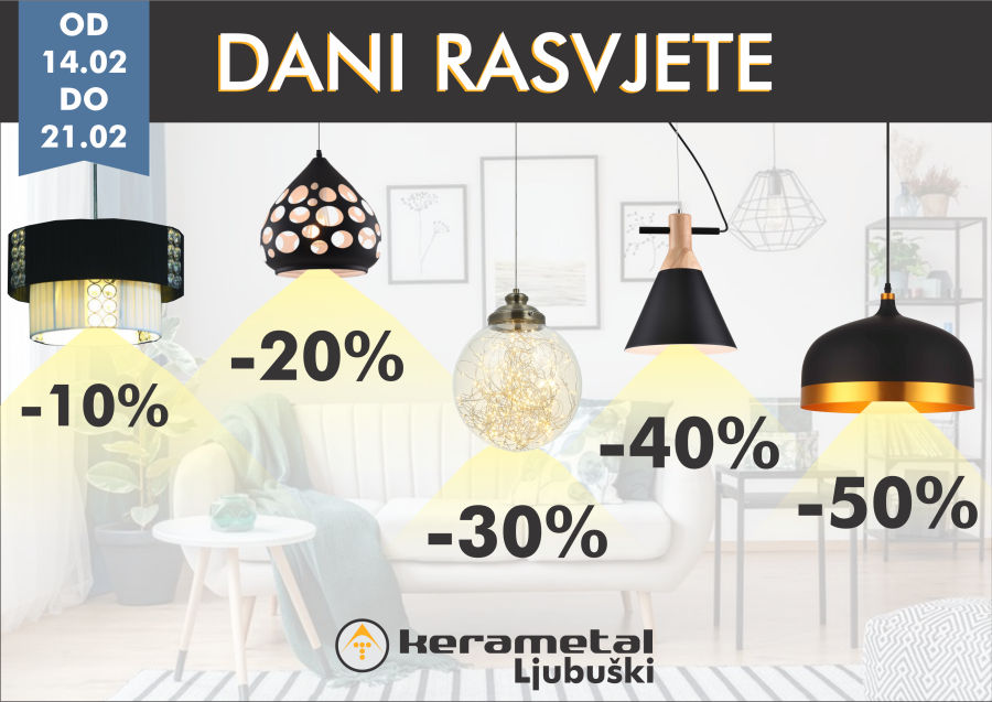 13.2.2019. - Ne propustite veliko sniženje rasvjete u prodajnom centru AT Kerametal. Posjetite naš odjel rasvjete od 14. do 21. veljače, u kojemu Vas očekuju popusti i do 50 %. Unesite svjetlo u svoj dom!