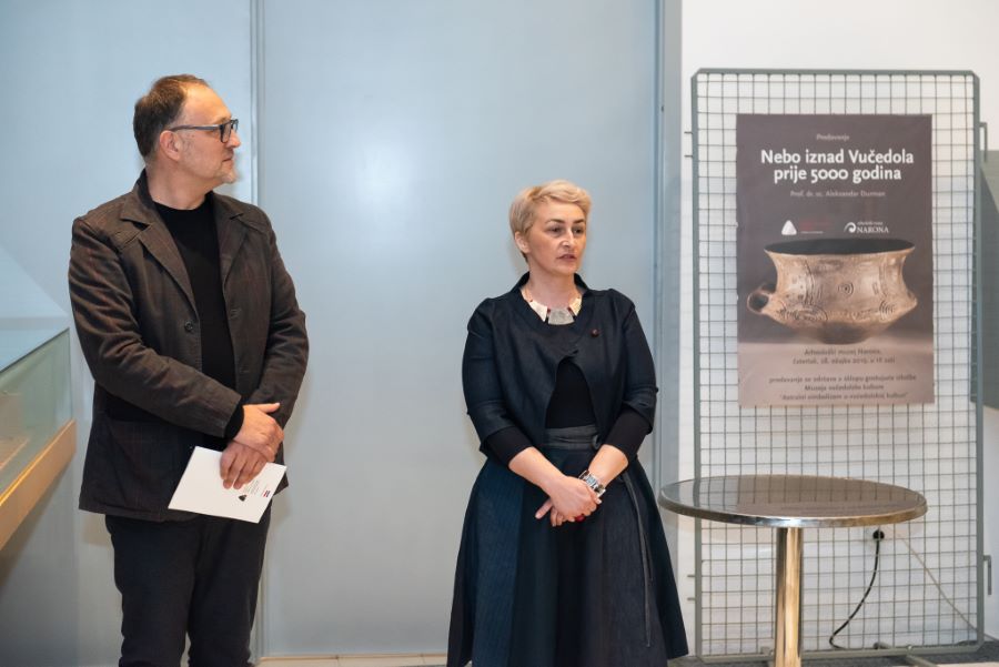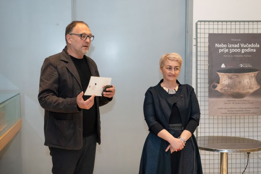 1.4.2019. - Arheološki muzej Narona nastavlja s organizacijom gostujućih izložaba. Tako je prošloga četvrtka ugostio Muzej vučedolske kulture, u sklopu čega je prof. Aleksandar Durman održao predavanje Nebo iznad Vučedola prije 5000 godina, nakon čega je otvorena izložba Astralni simbolizam u vučedolskoj kulturi.