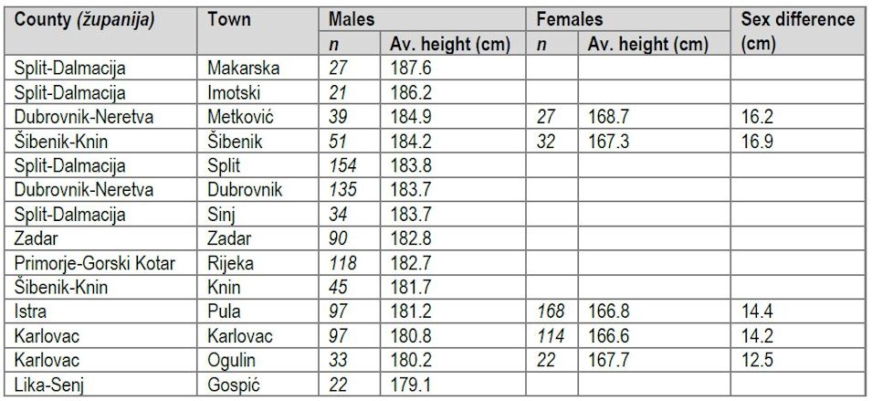 Objavljeni rezultati pokazuju da su Dalmatinski mladići viši od Nizozemaca, koji su do sada bili na vrhu. Isto tako, pokazalo se da u mladići u južnim jadranskim županijama u prosjeku za 3,8 cm viši od vršnjaka u sjevernim županijama. S 184.1 cm prednjači Splitsko-dalmatinska županija, slijedi Dubrovačko-neretvanska županija s 183.6 cm te Šibensko-kninska s 183.4 cm.