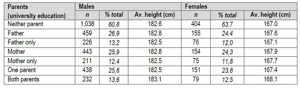 Zanimljivo je pogledati i tablicu koja pokazuje visinu mladića i djevojaka u odnosu na fakultetsko obrazovanje njihovih roditelja. Pokazalo se da su u prosjeku najviši oni čija su oba roditelja fakultetski obrazovana.