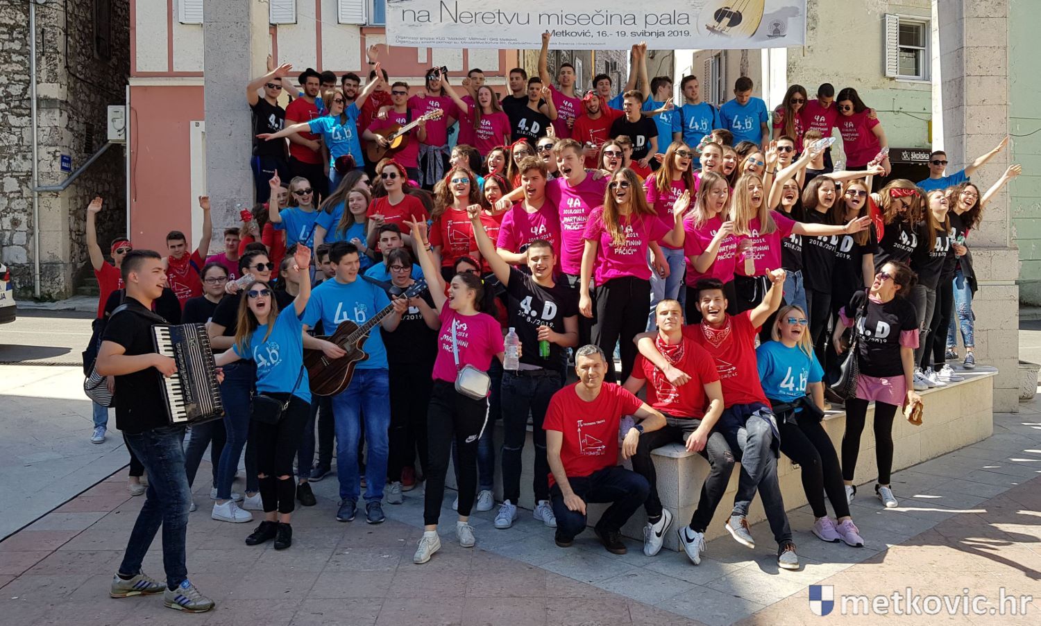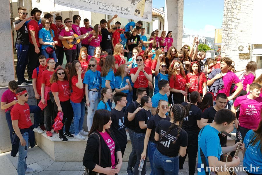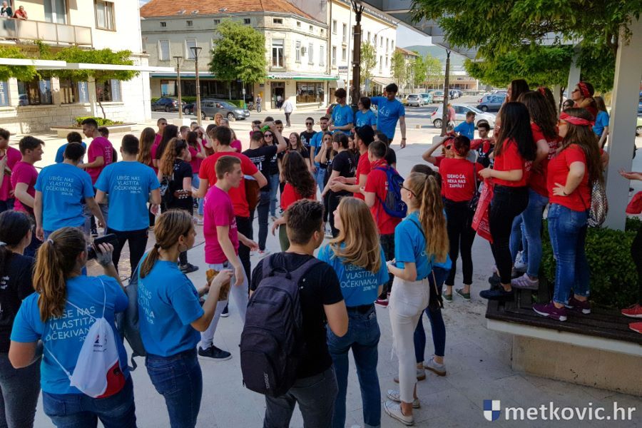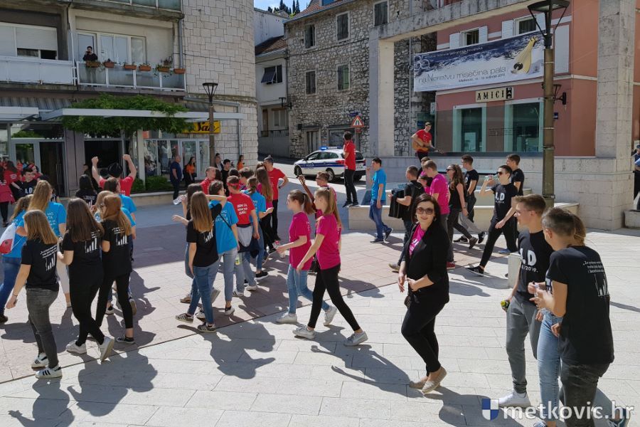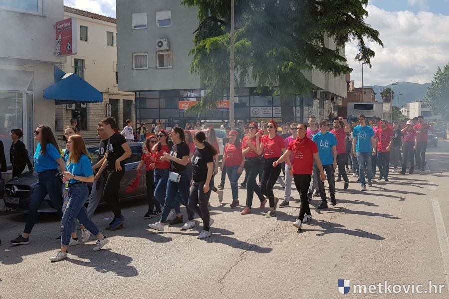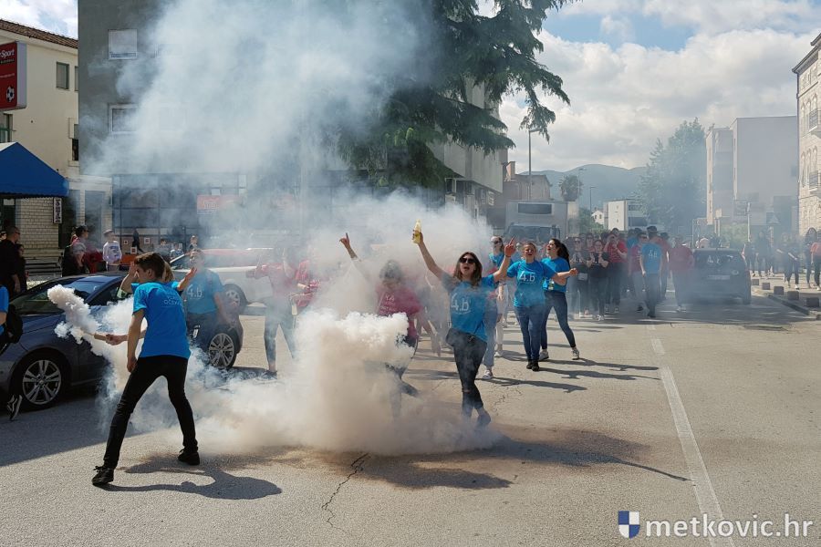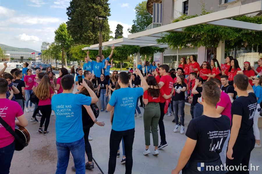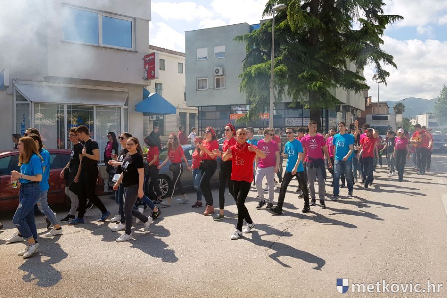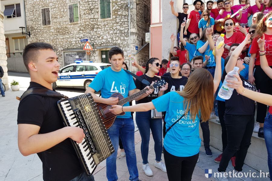 Metković, 22.5.2019. - Bučno i veselo metkovski maturanti danas slave posljednji dan nastave. Mi smo ih zatekli kako od škole kreću ka Trgu kralja Tomislava. Danas pred podne u Sportskoj ulici plesat će četvorku u sklopu plesnog projekta Maturantska parada 2019. – Quardilla dance parade 2019.