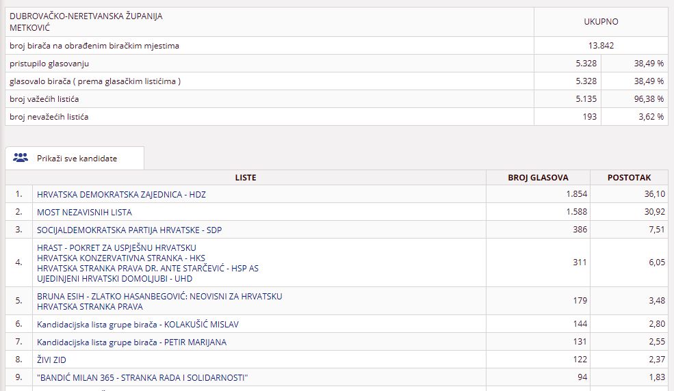 Rezultati izbora u Metkoviću s popisom triju kandidata koji su osvojili najviše preferencijskih glasova:  METKOVIĆ | UKUPNO | | broj birača na obrađenim biračkim mjestima | 13.842 | | pristupilo glasovanju | 5.328 | 38,49 % | glasovalo birača ( prema glasačkim listićima ) | 5.328 | 38,49 % | broj važećih listića | 5.135 | 96,38 % | broj nevažećih listića | 193 | 3,62 % |