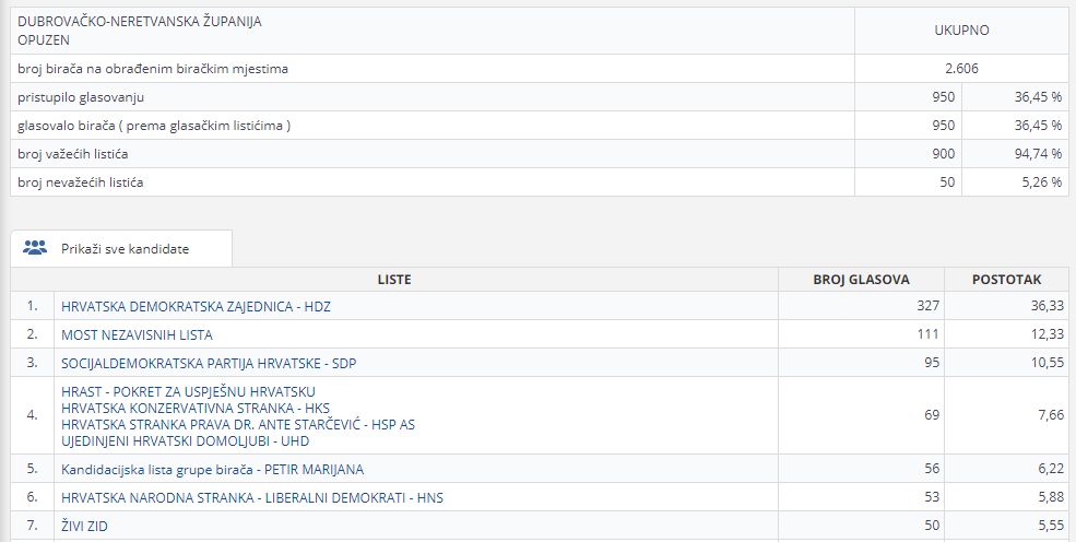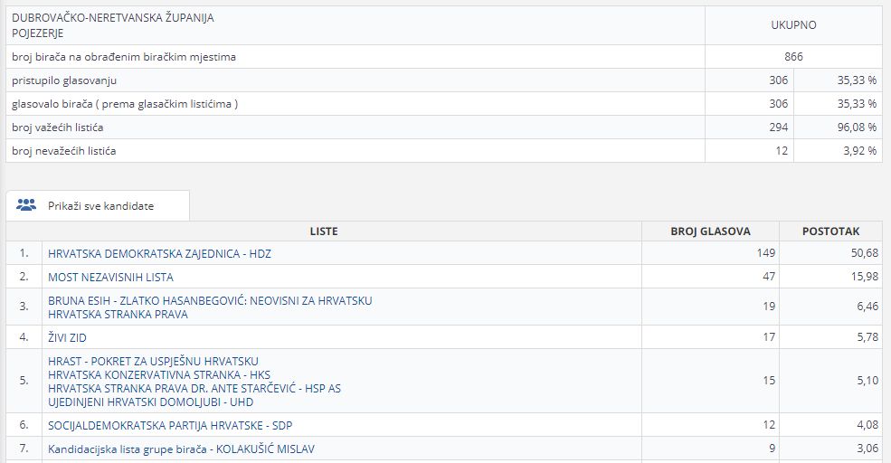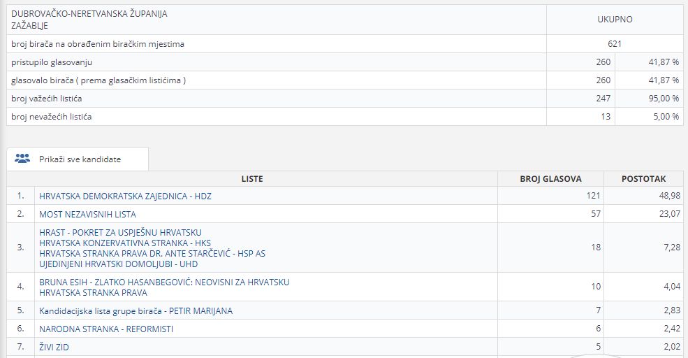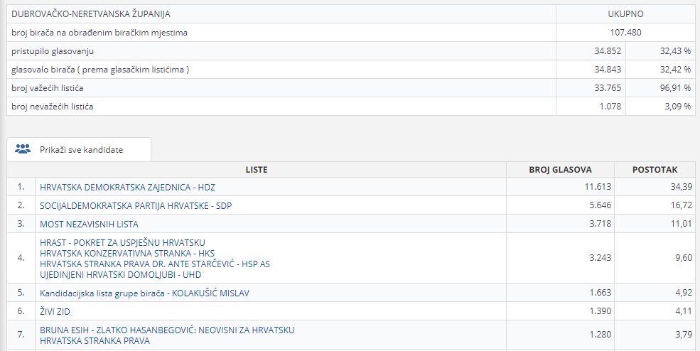 Evo i rezultara u Dubrovačko-neretvanskoj županiji te u šest ostalih neretvanskih gradova i općina: DUBROVAČKO-NERETVANSKA ŽUPANIJA  Evo i kandidata koji su dobili najveći broj preferencijskih glasova u Dubrovačko-neretvanskoj županiji: 1. | DUBRAVKA ŠUICA | 4.054 | 34,90 | 2. | RUŽA TOMAŠIĆ | 2.602 | 80,23 | 3. | TONINO PICULA | 1.850 | 32,76 | 4. | BOŽO PETROV | 1.775 | 47,74 | 5. | KARLO RESSLER | 1.523 | 13,11 | 6. | MISLAV KOLAKUŠIĆ | 1.359 | 81,71 | 7. | BILJANA BORZAN | 1.229 | 21,76 | 8. | MARIJANA PETIR | 701 | 82,86 | 9. | BRUNA ESIH | 572 | 44,68 | 10. | IVAN VILIBOR SINČIĆ | 338 | 24,31 |
