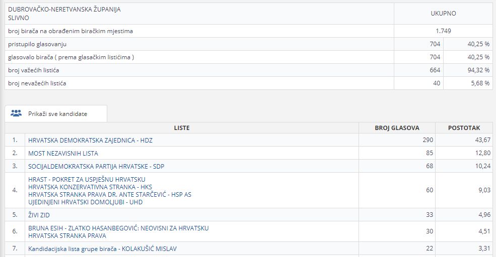 | | BROJ GLASOVA | POSTOTAK | | | 179 | 3,48 | 1. | BRUNA ESIH | 82 | 45,81 | 2. | ZLATKO HASANBEGOVIĆ | 34 | 18,99 | 3. | ŽELJKO GLASNOVIĆ | 24 | 13,40 | | Od 179 glasača preferencijske dalo | 157 | 87,71 |