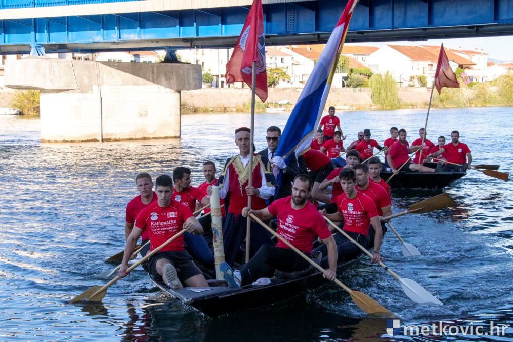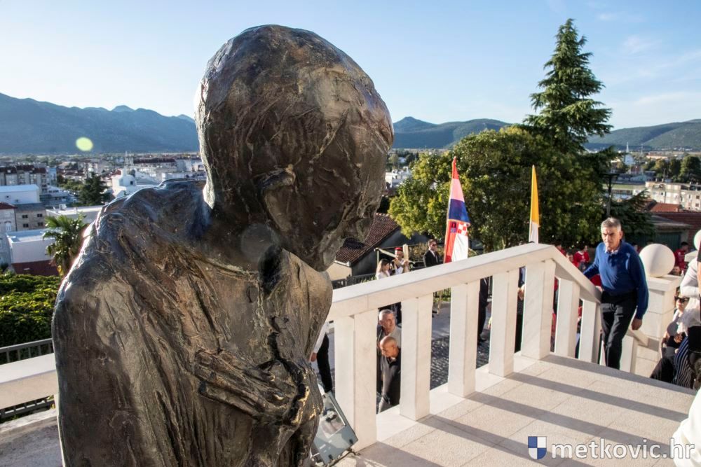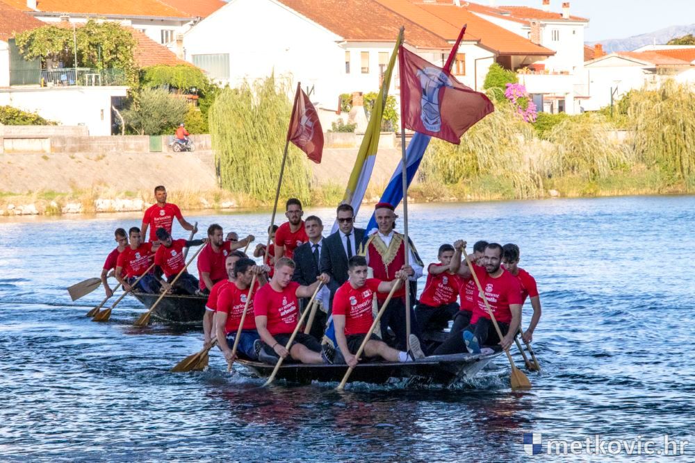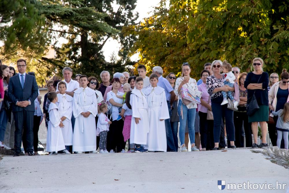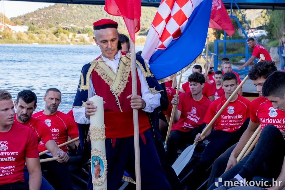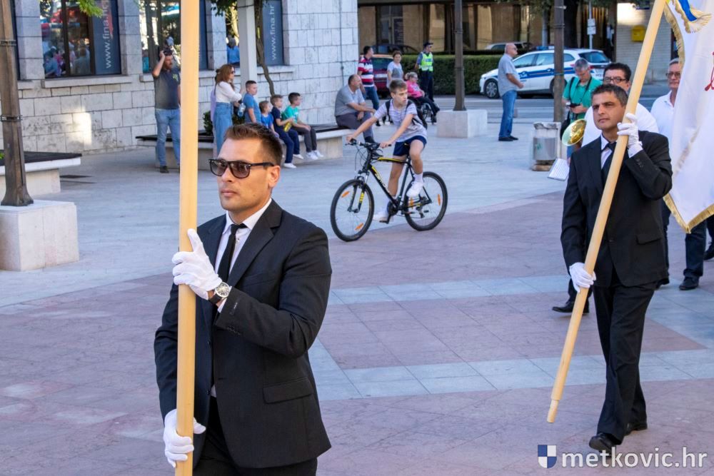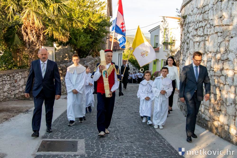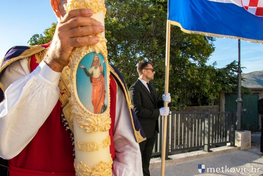 Praćeni građanima i Gradskom glazbom Metković potom su u mimohodu krenuli preko Trga i Ulicom Vladimira Nazora do župne crkve, pred kojom ih je čekao župnik fra Ante Bilokapić, koji je blagoslovio svijeću i zastavu. Zastava je nakon prigodne ceremonije izvješena na crkvenome zvoniku, a svijeća svečano unesena u crkvu. Potom je započelo misno slavlje, što ga je u suslavlju sa župnikom i župnim kapelanom fra Darijom Sinkovićem predvodio fra Šimun Bilokapić.