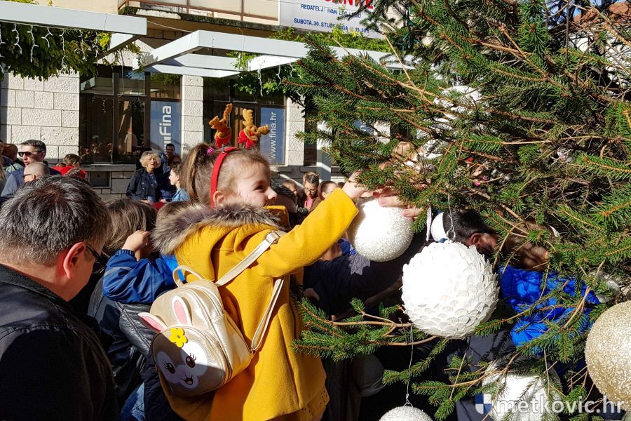 30.11.2019. - U organizaciji Turističke zajednice grada Metkovića jutros su djeca iz Dječjega vrtića Metković, DV Leut, DV Mali Isus i OŠ Stjepana Radića, uz pomoć metkovskih vatrogasaca, blagdanski ukrasila jelu na Trgu kralja Tomislava. Njima su se pridružili i štićenici Doma za odrasle osobe i rehabilitaciju Metković.