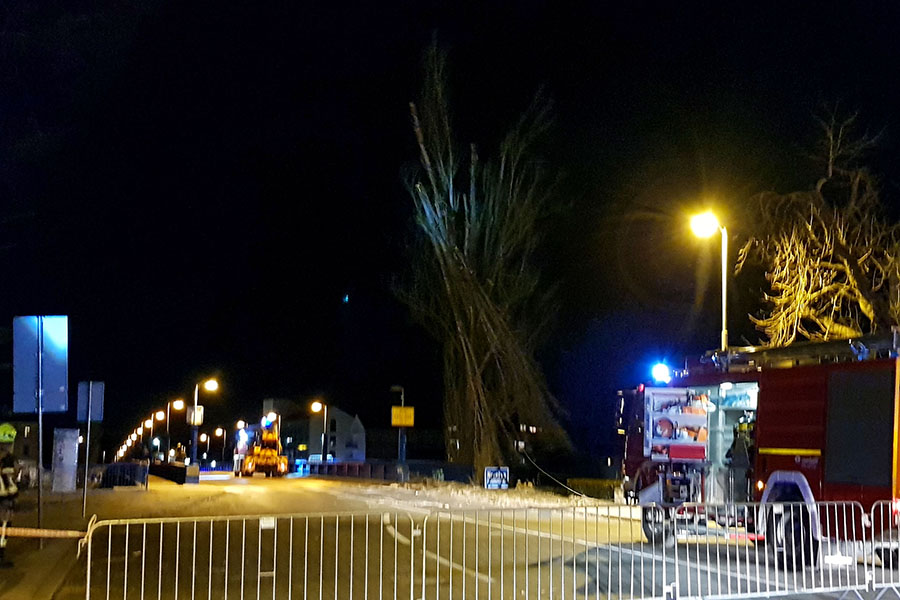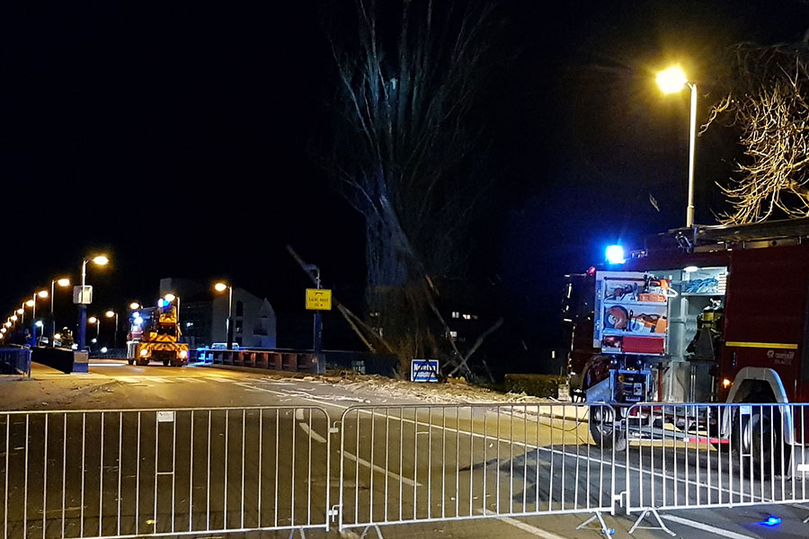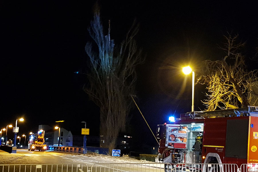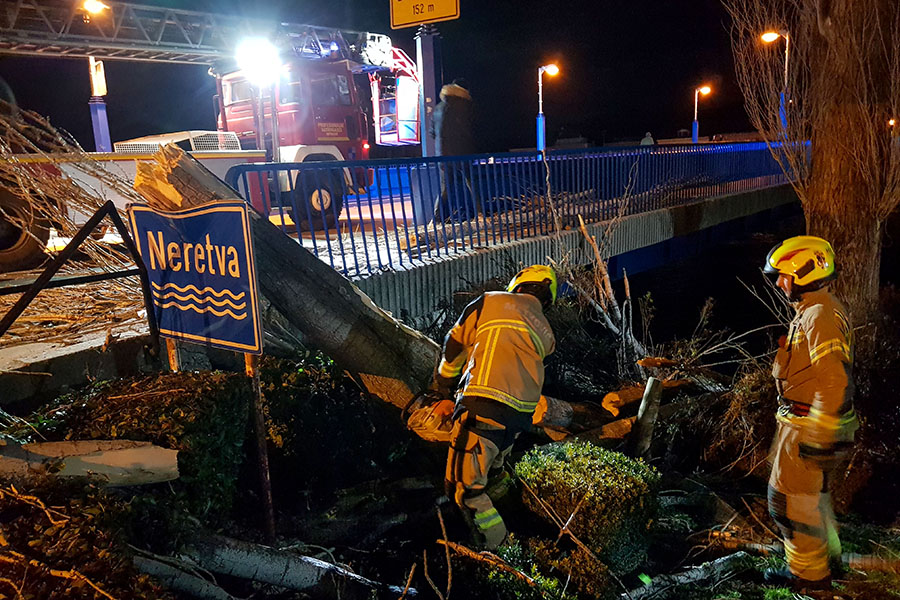 Metković, 5.2.2020. - Djelatnici JVP Metković večeras su nešto prije 20 sati uspjeli ukloniti nekoliko opasnih grana na prelomljenom jablanu uz Lučki most pa je on otvoren za promet. Vozače i pješake upozorava se na poseban oprez pri stupanju na most i silasku s njega na lijevoj obali Neretve.