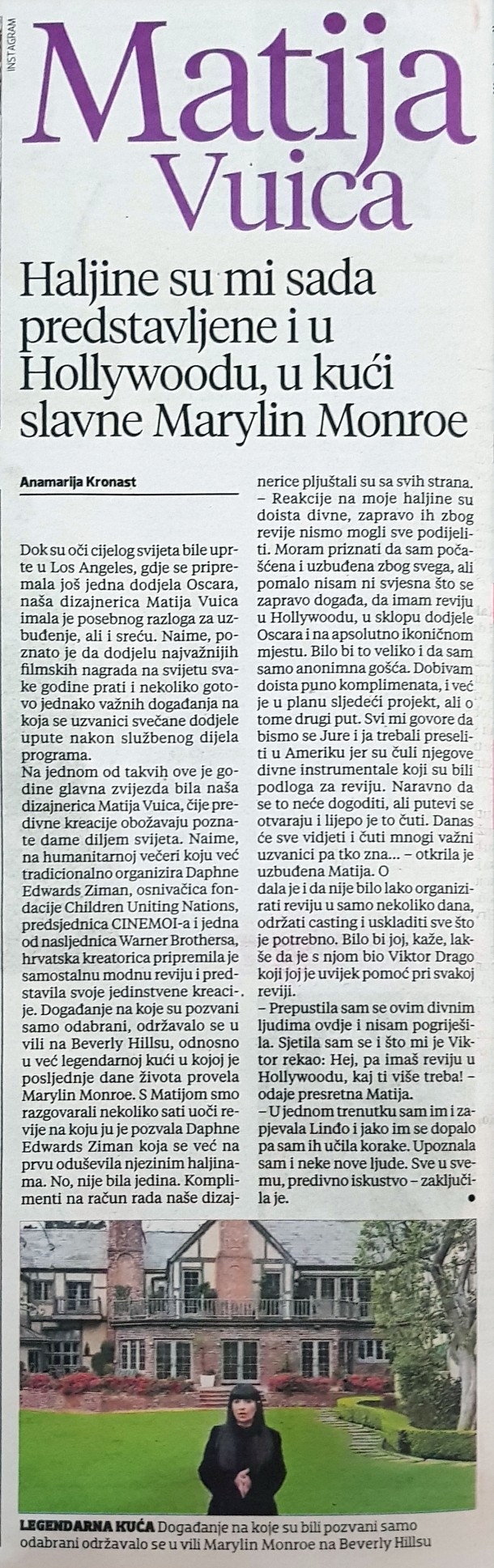 Metković, 11.2.2020. - „Dok su oči cijelog svijeta bile uprte u Los Angeles, gdje se pripremala još jedna dodjela Oscara, naša dizajnerica Matija Vuica imala je posebnog razloga za uzbuđenje, ali i sreću.“ – piše današnji Večernji list o senzacionalnom uspjehu metkovsko-zagrebačke modne dizajnerice.