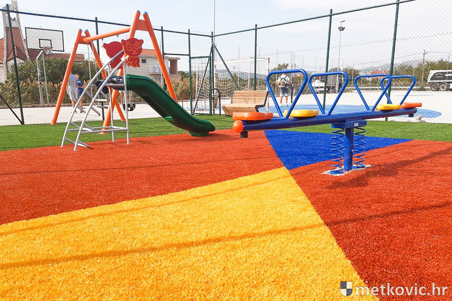 Na igralištu u Ulici Ante Starčevića postavljene su nove sprave i nova antistres podloga prilagođena standardima sigurnosti te, iznad nje, umjetna trava namijenjena dječjim igralištima.