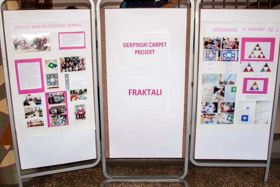 Riječ je o fraktalu koji je prvi opisao poljski matematičar Waclav Sierpinski. Počinje se s kvadratom (nulta iteracija) koji se dijeli na 9 manjih kvadrata, središnji kvadrat se oduzme i postupak se ponavlja na preostalih osam (druga iteracija). Svaka nova iteracija osam je puta veća od prethodne. Sierpinski Carpet nastaje nakon beskonačnog broja iteracija. Zadatak svih sudionika izrada je tzv. matematičkoga tepiha pomoću dvobojnih naljepnica kvadrata duljine stranice 2 cm i predložaka. Učiteljica je pohvalila svih šezdeset četvero učenika koji su na radionicama individualnim i timskim radom pokazali urednost, preciznost, kreativnost i izvrsnu suradnju.