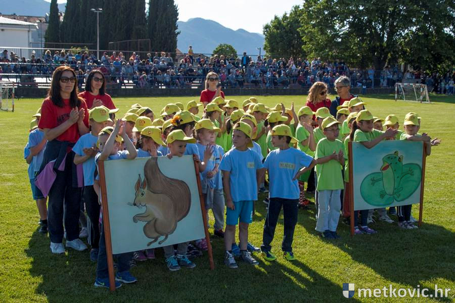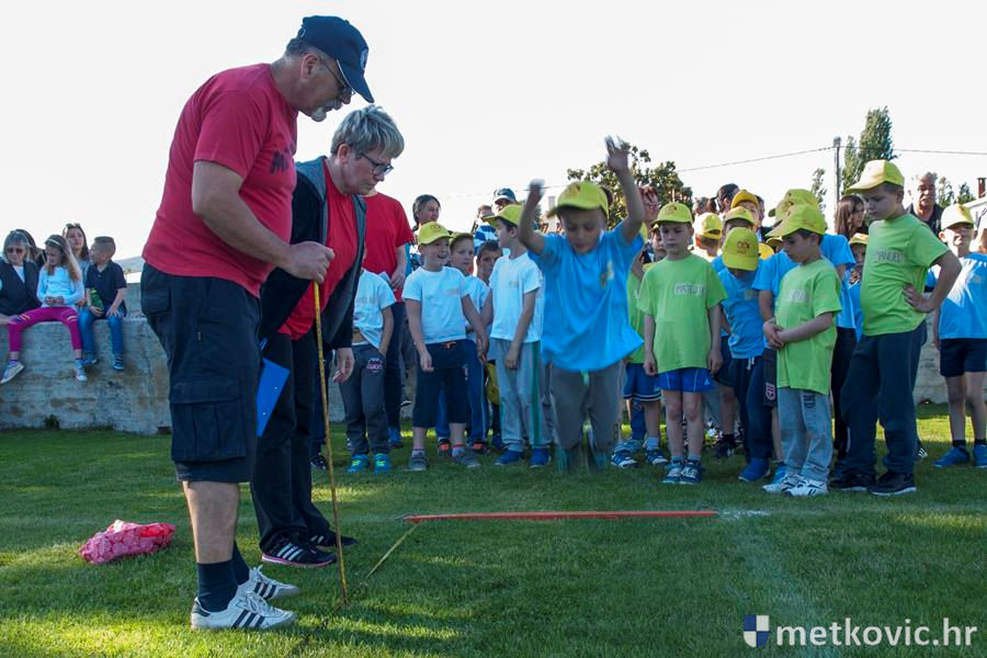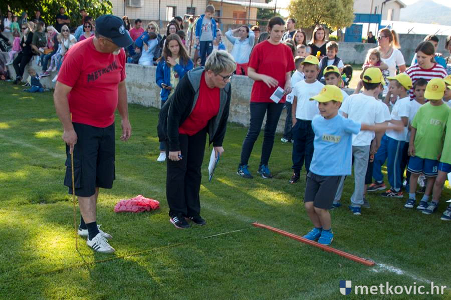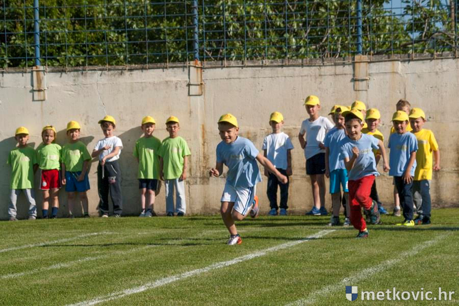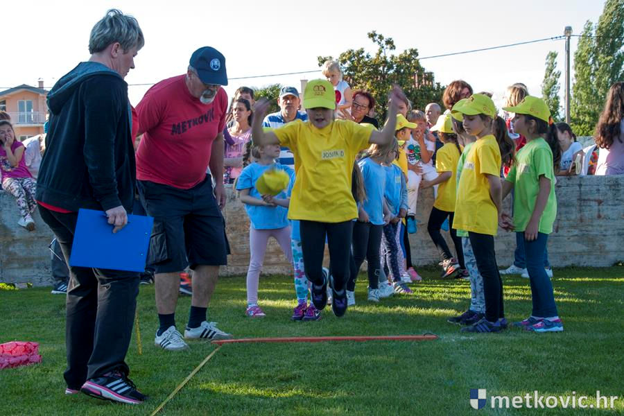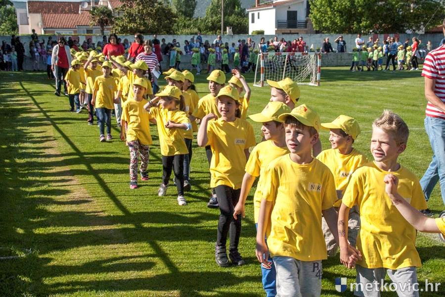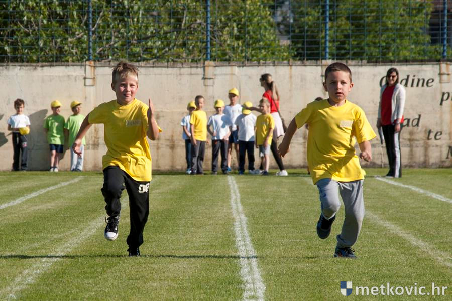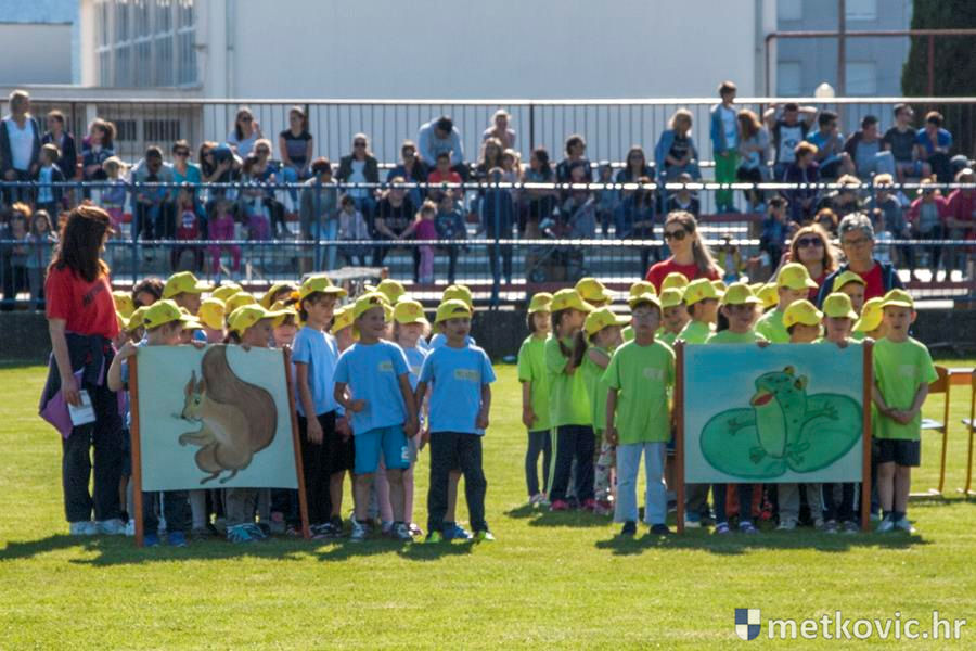 Četiri ekipe: Slavuji, Galebovi, Vjeverice i Žapci, svaka u svojim majicama i s kapama, natjecale su se u tima atletskim disciplinama: trčanju na 50 m, skoku udalj s mjesta i bacanju loptice, s time da su se odvojeno natjecali dječaci i djevojčice, a na kraju je uz bučno navijanje odigran malonogometni turnir.