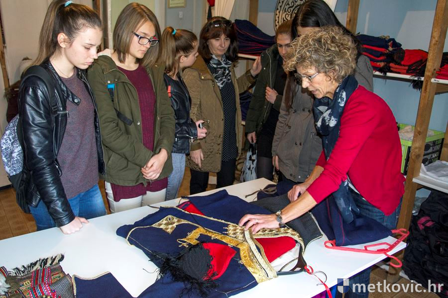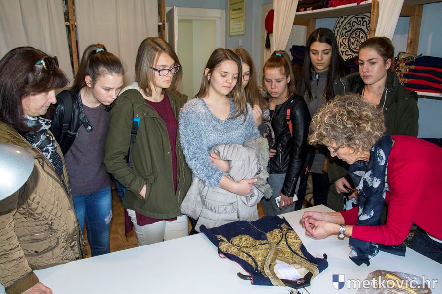 Metković, 16.11.2016. - Učenice Srednje škole Metković, smjera odjevni tehničar, sa svojom su razrednicom Jadrankom Nikolić u sklopu dopunske nastave posjetili garderobu KUD-a Metković, u kojoj im je voditeljica garderobe Paula Miličević prikazala dijelove muške i ženske nošnje neretvanskog kraja.