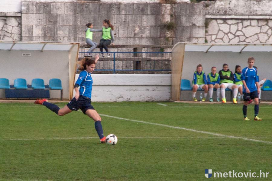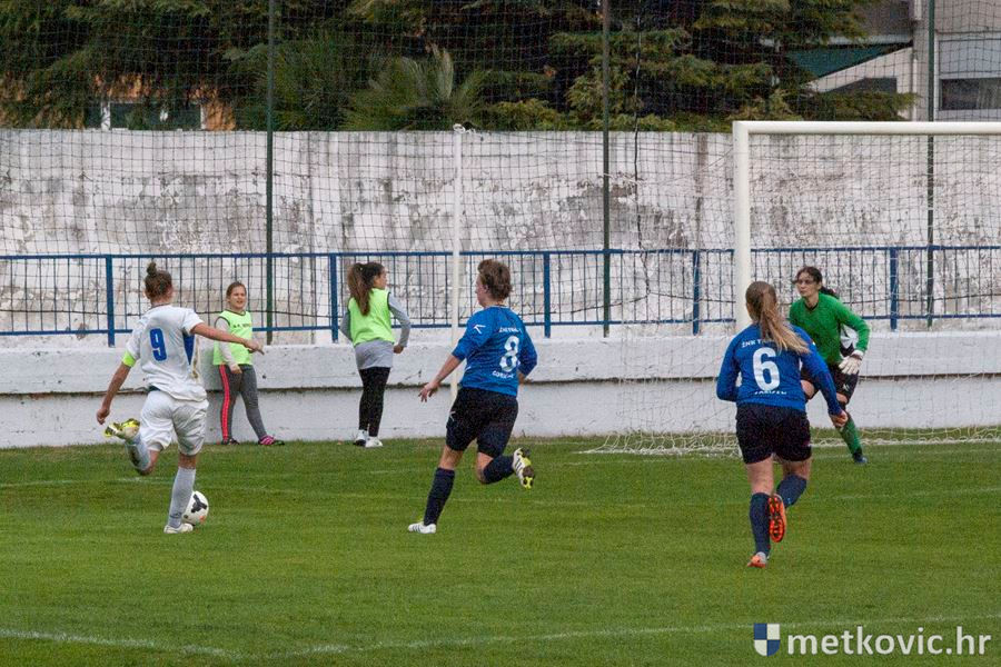 Hladan tuš za domaće nogometašice uslijedio je veću u 3. minuti kada su gošće pogotkom Sanje Herman povele 0:1. Metkovke to nije obeshrabrilo pa su zapele na terenu i već u 11. minuti na 1:1 izjednačile pogotkom Helene Perić. Tim se rezultatom otišlo se na predah.