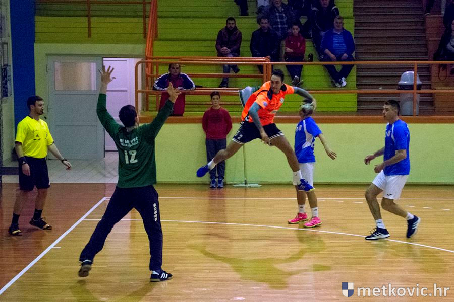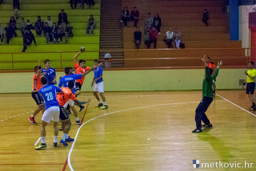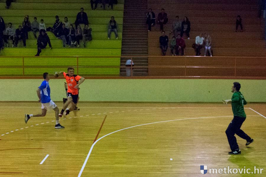 Dvoboj dviju neretvanskih momčadi krasila je brza i dinamična igra u kojoj nije nedostajalo pozitivnog sportskog naboja. Utakmica je otvorena izjednačenom igrom gol za gol te nijedna momčad nije uspjela steći značajniju prednost. Uvodno vodstvo Metkovaca od 4:2 gosti iz Opuzena su serijom 3:0 lakoćom pretvorili u vodstvo. Takav tempo i igra su se nastavili do kraja prvog poluvremena u kojemu su obje momčadi imale u isto vrijeme briljantne serije pogodaka, ali i crne rupe u igri s velikim brojem tehničkih grešaka. Na predah su domaćini otišli s minimalnim vodstvom pri rezultatu 16:15.