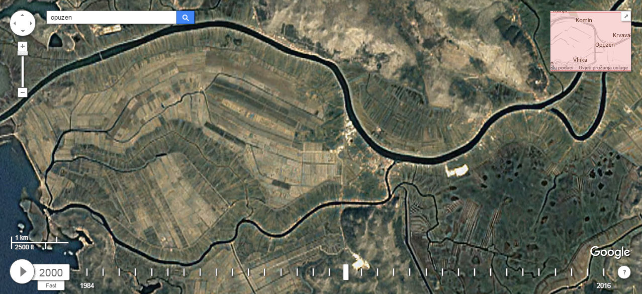 Zanimljivo je i područje Opuzena, i uzvodno i nizvodno, naročito kada je riječ o poljoprivrednim površinama. U odnosu na 1984. vide se promjene na zemljištu koje je pripadalo nekadašnjemu PIK-u Opuzen, uz metkovski Razvitak i Luku Ploče stožeru neretvanskoga gospodarskog trojstva. Još je zanimljivije pogledati što se događalo istočno od Opuzena u trokutu Opuzen-Metković-Kuti. Priroda je sve više uzmicala pod bagerima, naravno, ilegalno. Time se ni jedna vlast nije bavila, a izgleda da ni neće. Ipak, razumjeti treba i Neretvane koji su tako sebi osiguravali egzistenciju koju su izgubili u „privatizaciji“ uništavanjem svekolikoga neretvanskog gospodarstva.