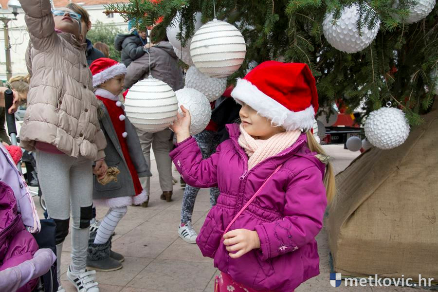 3.12.2016. - Na Trgu kralja Tomislava jutros je bilo šareno i veselo, a zašarenila su ga i razveselila djeca iz Dječjega vrtića Metković, kojima su se u ukrašavanju velike jele pridružila i druga djeca koju su roditelji doveli na Trg.